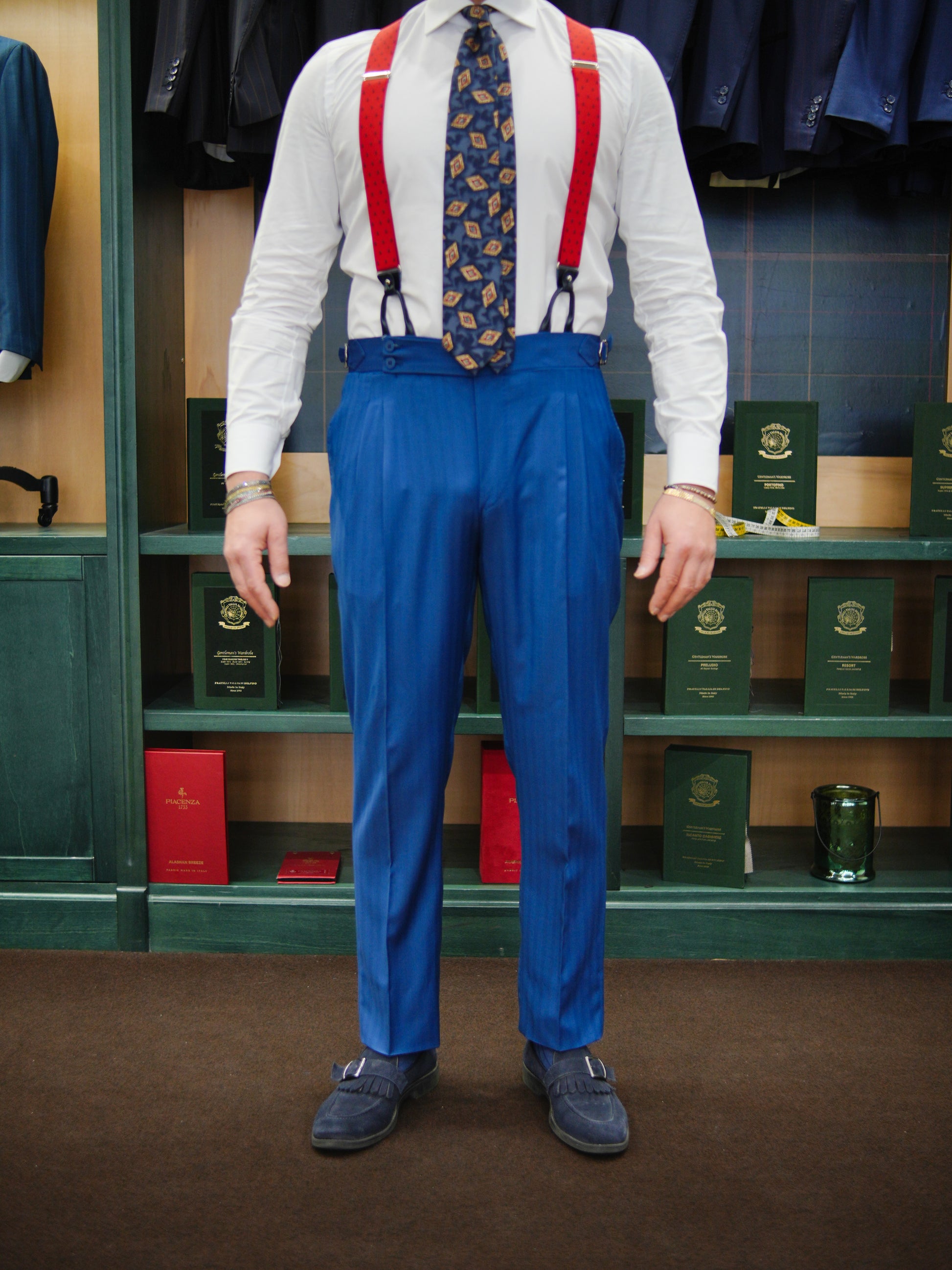Pantalone doppia pinces con bustino 5 CM con chiusura 14cm quadrata, con fibbie laterali e bottoni in madreperla laterale. Due tasche a filo posteriori più fintone impunturato e portamonete.