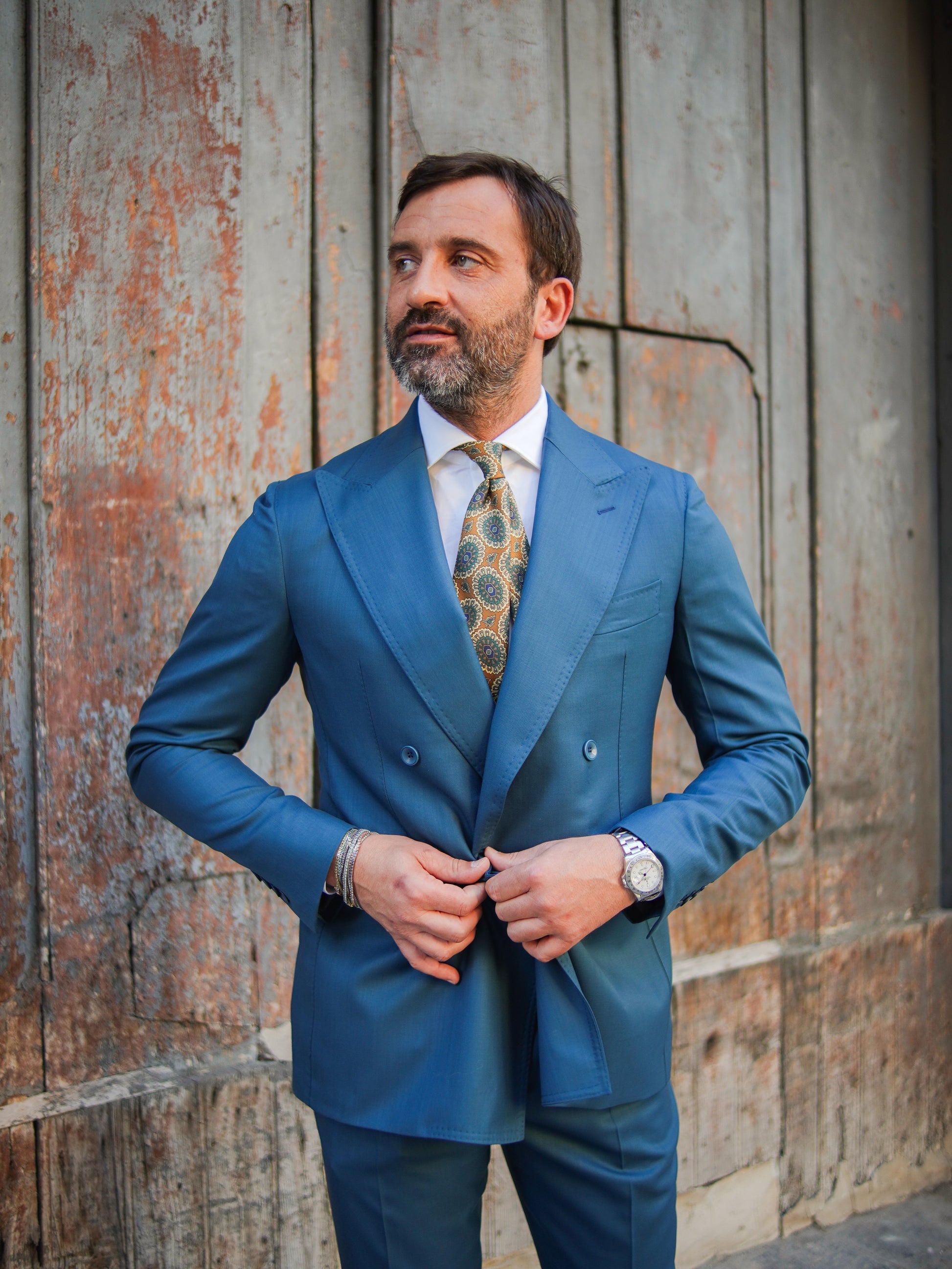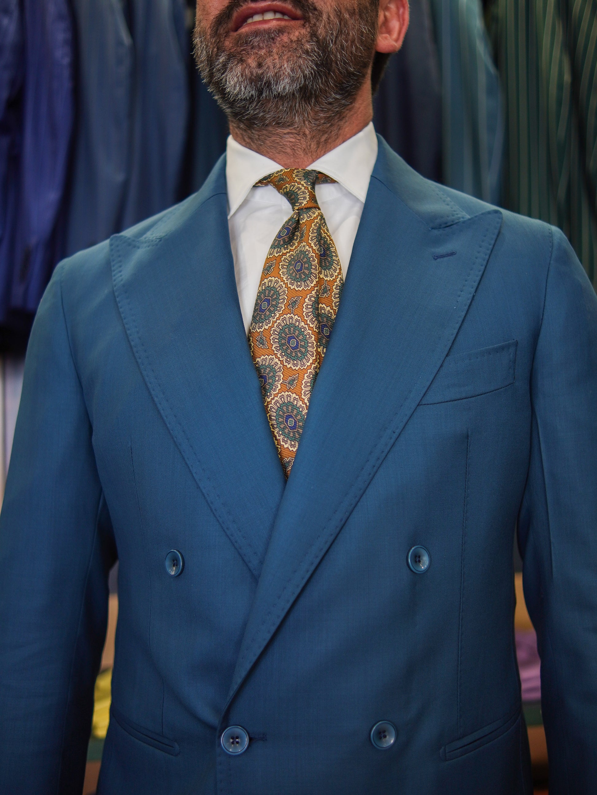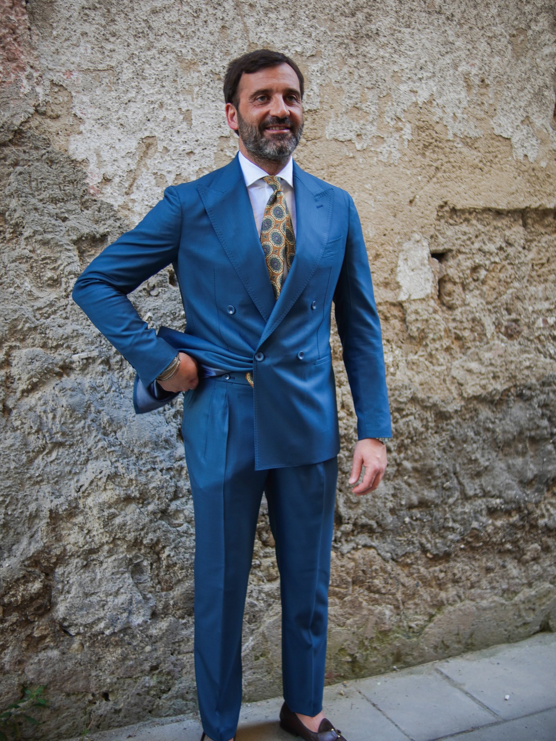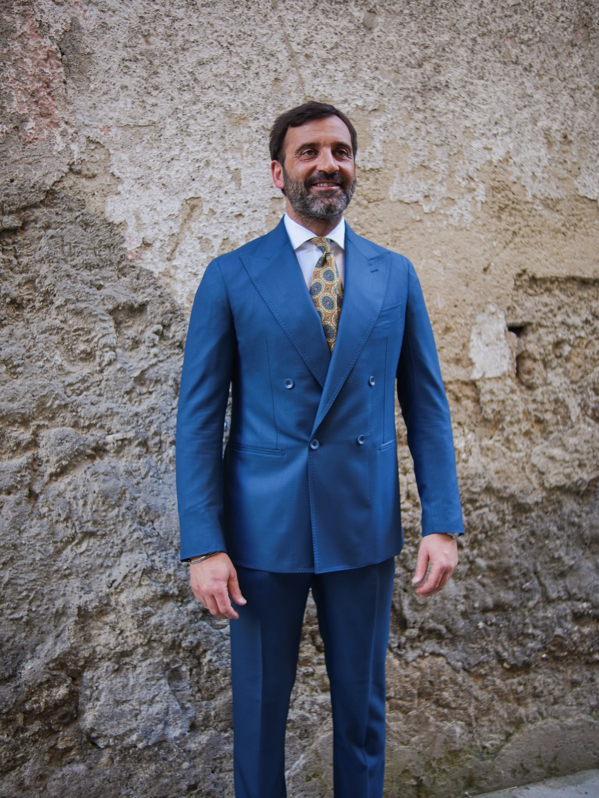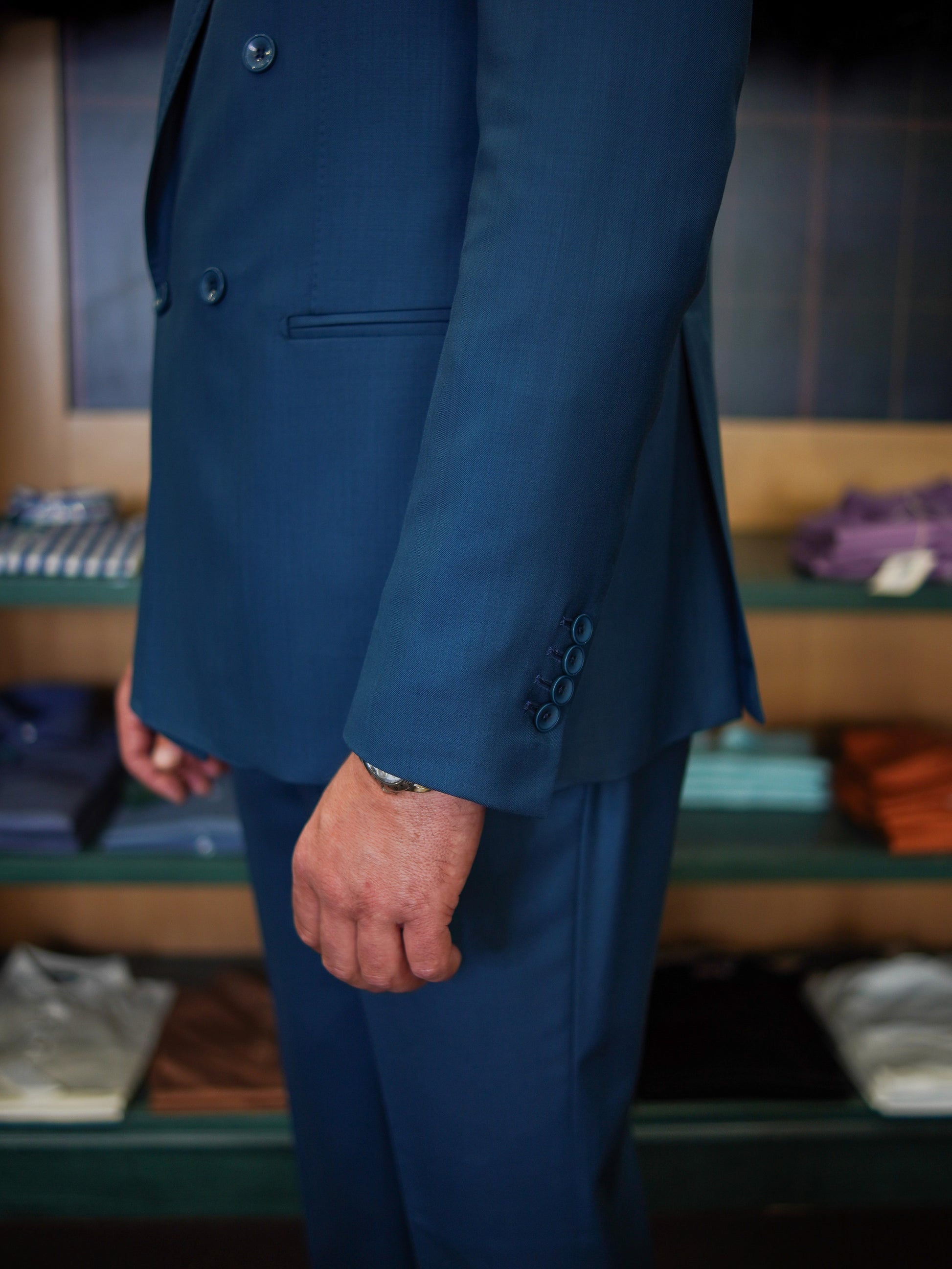 Pantalone tasca a filo doppia pinces con bustino 5 CM con chiusura quadrata, con fibbia e bottoni in madreperla laterale. Tasche più fintone impunturato.