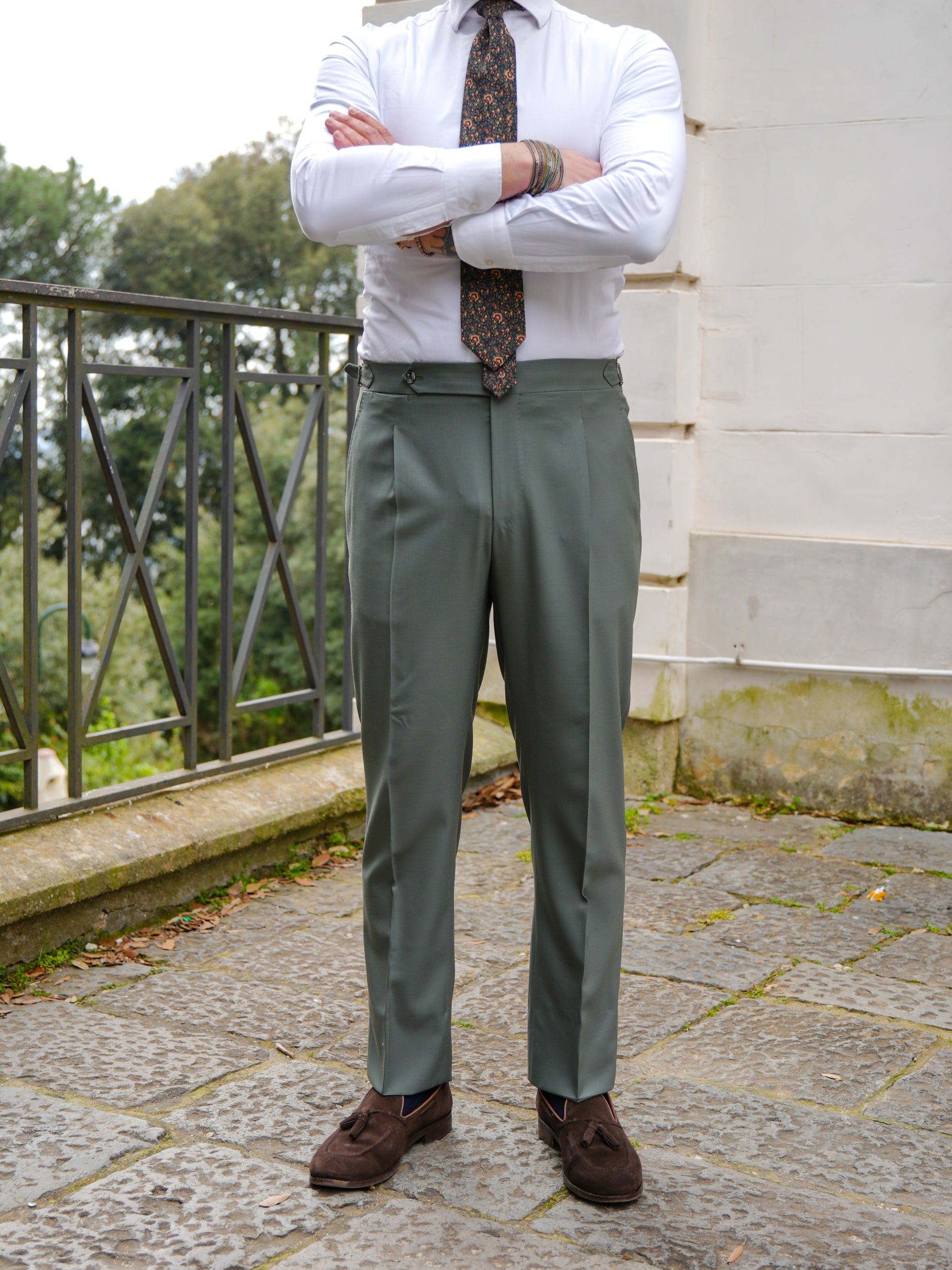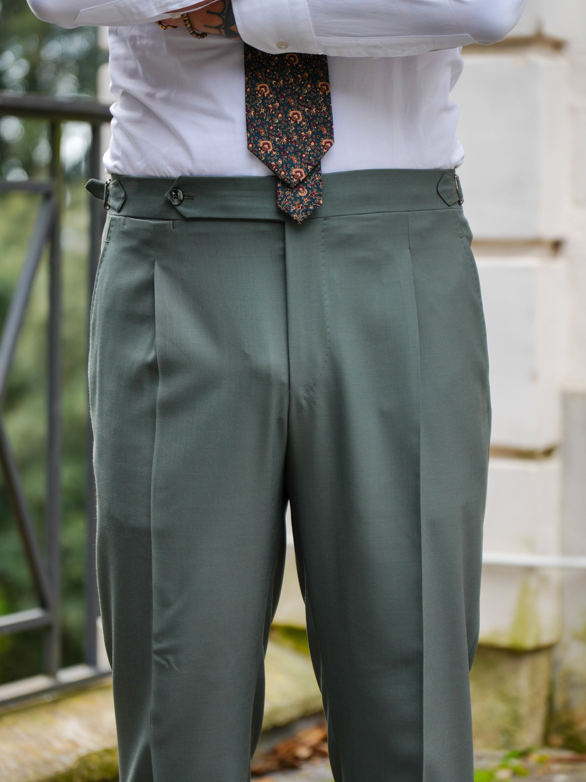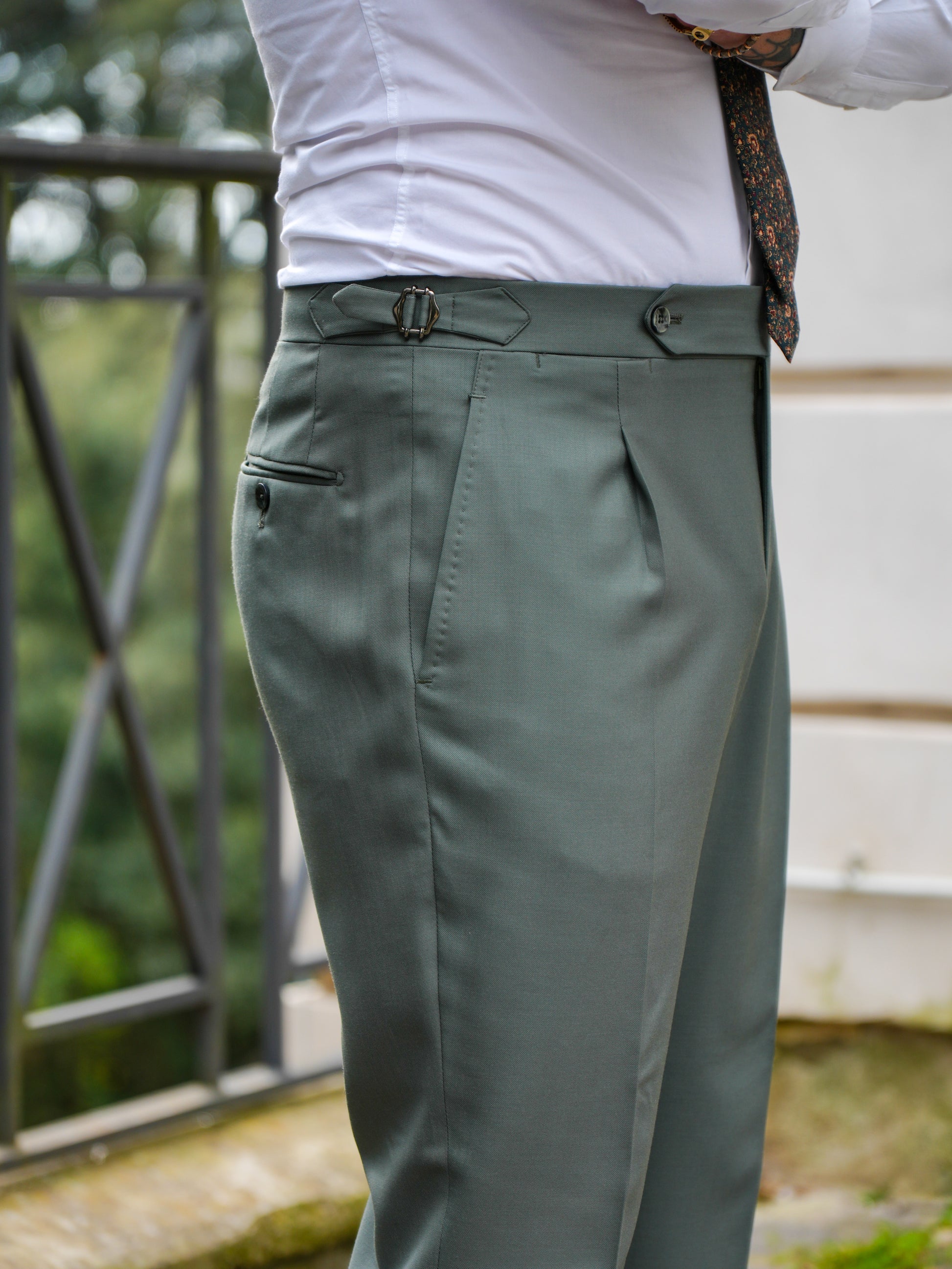 Pantalone tasca America, una pinces con bustino 4 CM con chiusura 12cm a punta, con fibbie laterali e bottoni in madreperla laterale. Due tasche a filo posteriori più fintone impunturato e portamonete.