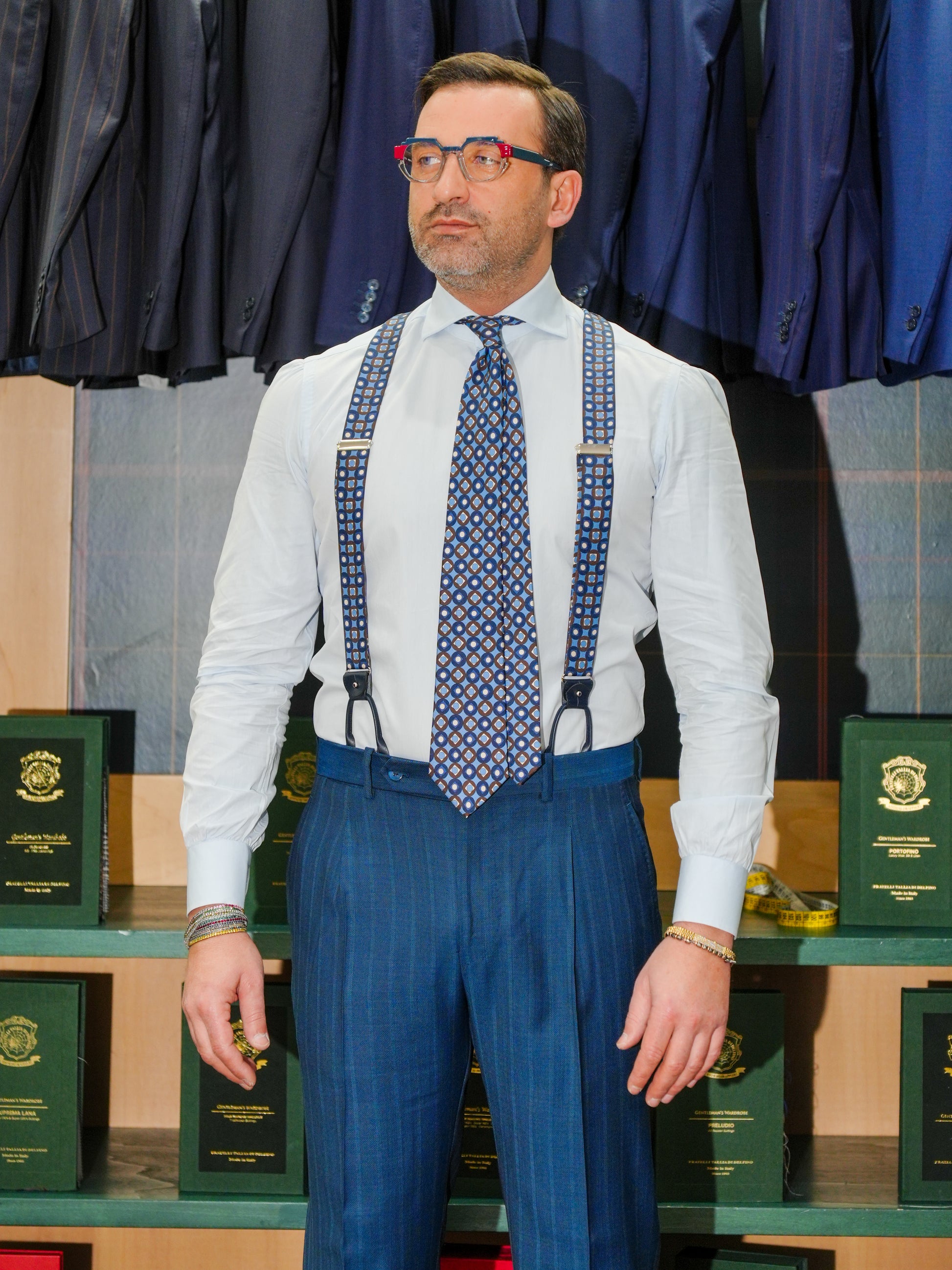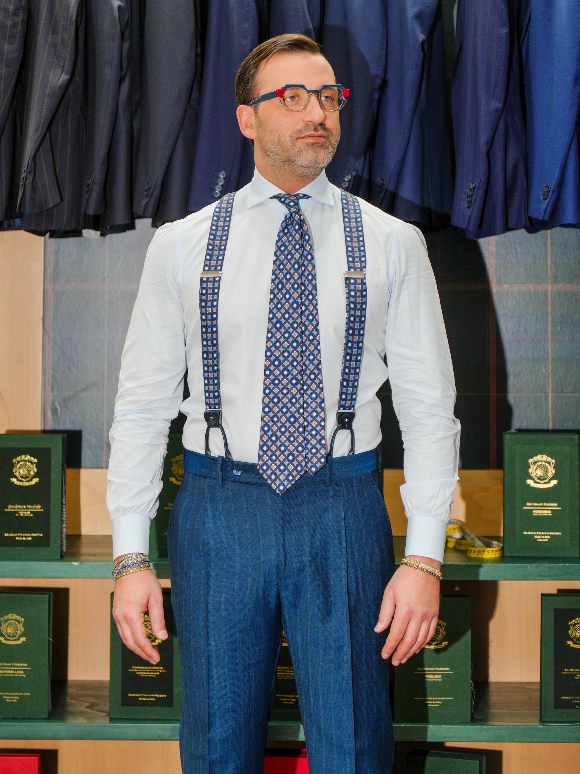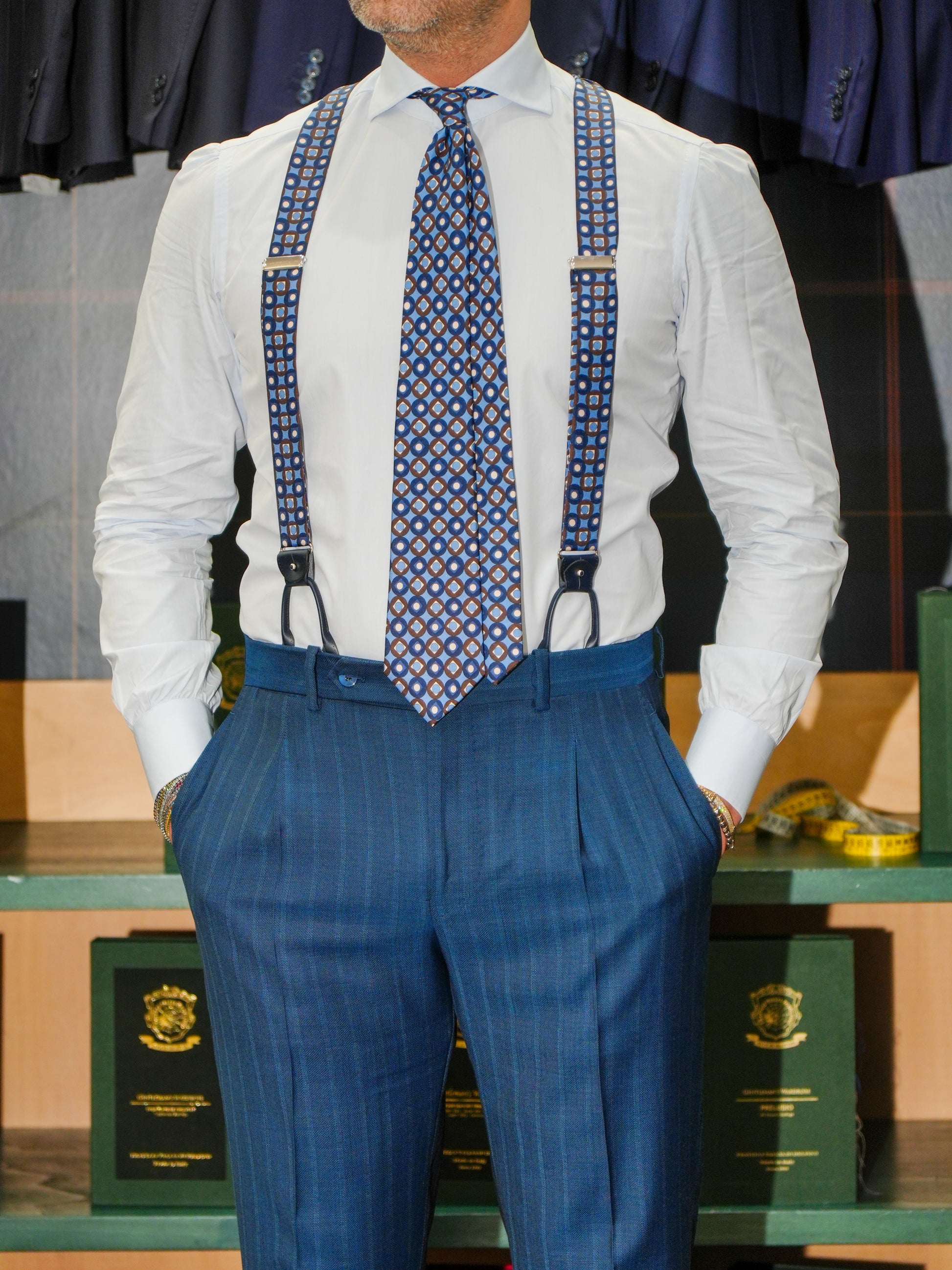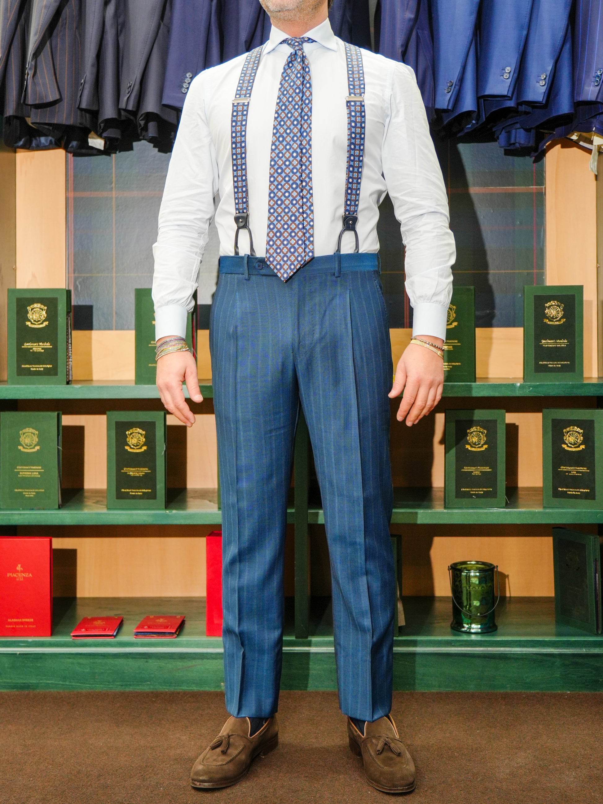 Pantalone tasca America 1 pinces con bustino 4 CM con chiusura a punta, bottoni in madreperla laterale. Tasche più fintone impunturato.